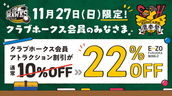 クラブホークス会員限定BOSS E・ZO FUKUOKA対象アトラクション22%OFF