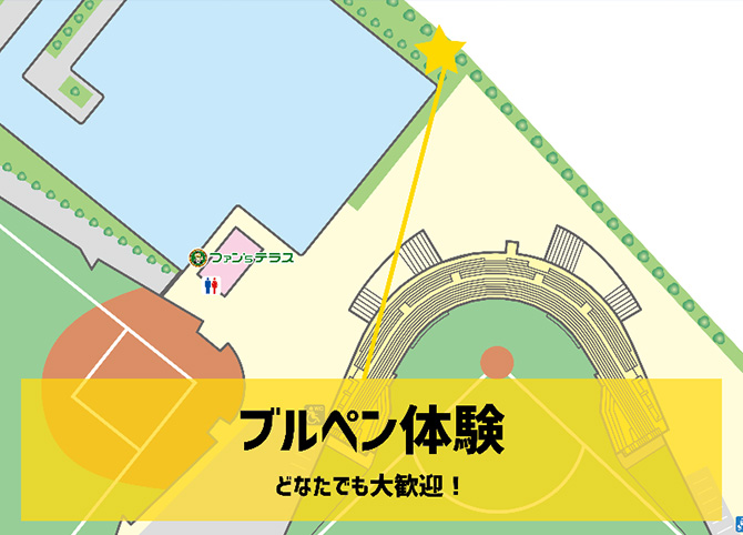 メインスタジアム同様のブルペンを再現しています。マウンドからホームベースに向かって投げてみよう♪フォトスポットとしても利用OK!